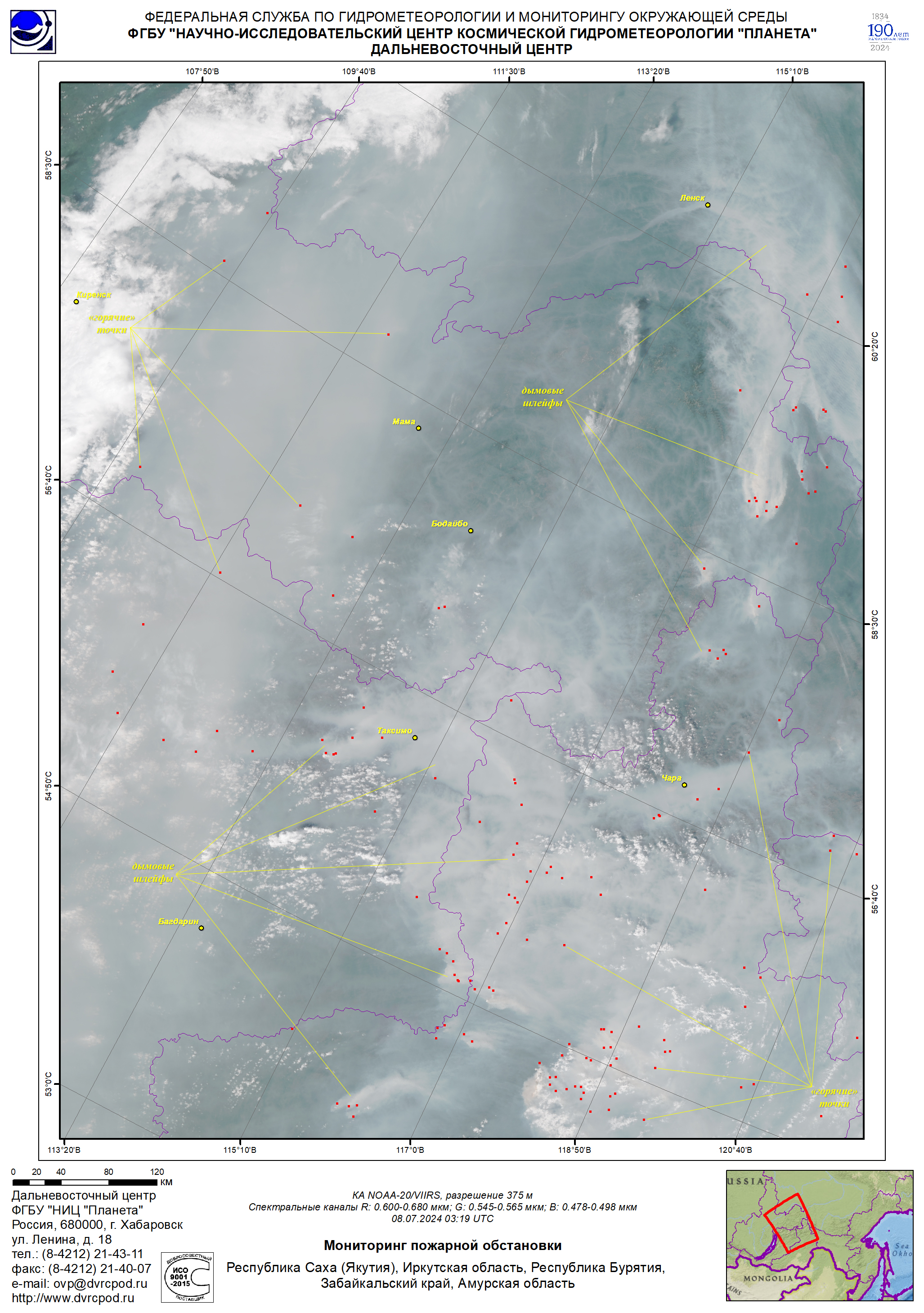 В связи с продолжительным периодом жаркой и относительно сухой погоды на территории Республики осложнилась пожароопасная ситуация. По оперативной информации ФГБУ «Забайкальское УГМС» по состоянию на 10.07.2024 в Баунтовском районе сохраняется чрезвычайная пожарная опасность 5 класса (комплексный показатель пожарной опасности более 10000С по Нестерову) категории опасного метеорологического явления, на остальной территории – преимущественно 4 (высокий) класс пожарной опасности по региональной шкале. По прогнозу ФГБУ «Забайкальское УГМС» в период 10-12 июля в Баунтовском районе сохранится, 11 июля в Северобайкальском, Кабанском, 11-12 июля в Иволгинском, Хоринском, Кяхтинском, Баргузинском, Курумканском районах сохранится, 12-13 июля в Муйском районе ожидается 4 (высокий) класс пожарной опасности леса (региональная шкала). По данным спутникового мониторинга Дальневосточного центра ФГБУ «НИЦ «Планета» Росгидромета за 7 июля многочисленные «горячие» точки отмечались на территории края (рис.1). Рис.1. Мониторинг пожарной обстановки по данным космического зондирования Республики Бурятия за 07.07.2024 г. Заместитель МЧС России В.Яцуценко на заседании Правительственной комиссии по предупреждению и ликвидации чрезвычайных ситуаций и обеспечению пожарной безопасности 3 июня 2024 года объявил о введении режима «Чрезвычайная ситуация» межрегионального характера с федеральным уровнем реагирования на территории Республики Бурятия и Забайкальского края (протокол № 5 от 03.06.2024), который сохраняется по настоящее время. По оперативной информации ФБУ «Авиалесоохрана» на 00:00 мск 07.07.2024 по Республике проводились работы по активному тушению: - 52 пожара на землях лесного фонда на площади, пройденной огнем 15 273 га; - 1 пожар на землях обороны и безопасности на площади, пройденной огнем 40 га; - 1 пожар на землях особо охраняемых природных территорий на площади, пройденной огнем 11 га (ГПБЗ «Баргузинский»). Всего с 01.01.2024 по 08.07.2024 зарегистрировано 332 лесных пожара на площади 127275,66 га, возникших на территории Республики в зонах наземного обнаружения и тушения и лесоавиационных работ по данным региональных диспетчерских служб лесного хозяйства.
