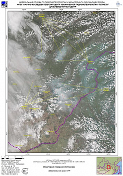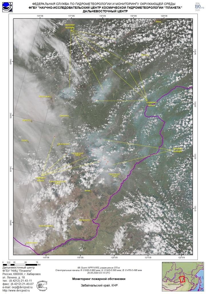В связи с преобладанием сухой и жаркой погоды, начиная с третьей декады апреля, местами в отдельных районах края начал отмечаться высокий (4 класс) пожарной опасности в лесах по условиям погоды (региональная шкала). По оперативной информации ФГБУ «Забайкальское УГМС» по состоянию на 22.05.2024 в Забайкальском, Карымском, Александрово-Заводском, Нерчинско-Заводском, Оловяннинском, Шилкинском, Балейском, Нерчинском, Чернышевском, Газимуро-Заводском, Калганском, Краснокаменском районах отмечается чрезвычайная пожарная опасность 5 класса (комплексный показатель пожарной опасности более 100000С по Нестерову) категории опасного метеорологического явления, на остальной территории края – преимущественно 4 (высокий) класс пожарной опасности по региональной шкале. По прогнозу ФГБУ «Забайкальское УГМС» в период 23-25 мая существенных осадков и снижения температурного режима не ожидается по территории края, поэтому в крае сохранятся погодные условия способствующие возникновению и распространению лесных пожаров. По данным спутникового мониторинга Дальневосточного центра ФГБУ «НИЦ «Планета» Росгидромета за 20 мая «горячие» точки отмечались на территории края (рис.1). Рис.1. Мониторинг пожарной обстановки по данным космического зондирования Забайкальского края за 20.05.2024 г.